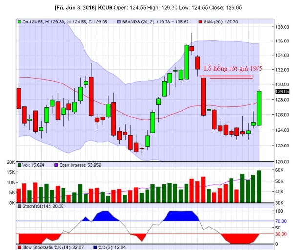 Riêng về đồ thị của thị trường New York, thì đã hoàn toàn rõ nét hơn bởi giá đã vượt mức giao dịch bình quân của 20 ngày qua, điểm quan trọng cần phải vượt trên thị trường tháng 9 là lỗ hổng (gap) đã tạo ra do sự rớt giá từ ngày 19/5/2016 hiện đang nằm ở mức 130,9cent. Nếu thị trường đi qua lại mức này thì về mặt tâm lý như là “ngã chỗ nào thì đứng dậy ở chỗ đó”, vượt được mức này rất quan trọng để giúp thị trường có thể tiến thẳng lên mốc 138cent/p.
