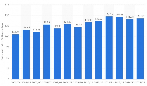 Về mặt tổng sản lượng của cả thế giới như đã đề cập nhiều trong các bài nhận định trước, cứ cho là Brazil được mùa nhưng cả cộng đồng Robusta như Việt nam, Indonesia, Ấn độ, Brazil đều bị mất do ảnh hưởng nặng nề El Nino và thời tiết khô hạn ở các nước trồng loại cà phê này, mức tăng có thể không lớn trong khi tỷ lệ nhu cầu cà phê thế giới cũng tăng (tham khảo tại đây)