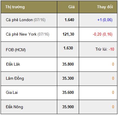 Hôm nay (28/05), giá cà phê tại thị trường Việt Nam không thay đổi so với ngày hôm qua, trong khi đó giá cà phê thế giới trên hai sàn London và New York tiếp tục diễn biến trái chiều nhau. Giá cà phê Robusta trên sàn London kỳ hạn 07/16 tăng nhẹ 1 USD/tấn, hay +0,06% lên mức 1.640 USD/tấn, các kỳ hạn khác không thay đổi hoặc tăng nhẹ 1 – 3 USD/tấn. Giá cà phê arabica trên sàn New York kỳ hạn 07/16 giảm nhẹ trở lại 0,20 cent/lb, hay-0,16% xuống còn 121,30 cent/lb, các kỳ hạn khác cũng giảm nhẹ 0,15 – 0,20 cent/lb. Sáng nay, giá cà phê nhân xô tại Tây Nguyên không thay đổi so với ngày hôm qua, vẫn ở mức 35,3 – 35,9 triệu đồng/ tấn.Chi tiết giá cà phê Việt Nam và thế giới ngày 28/05: